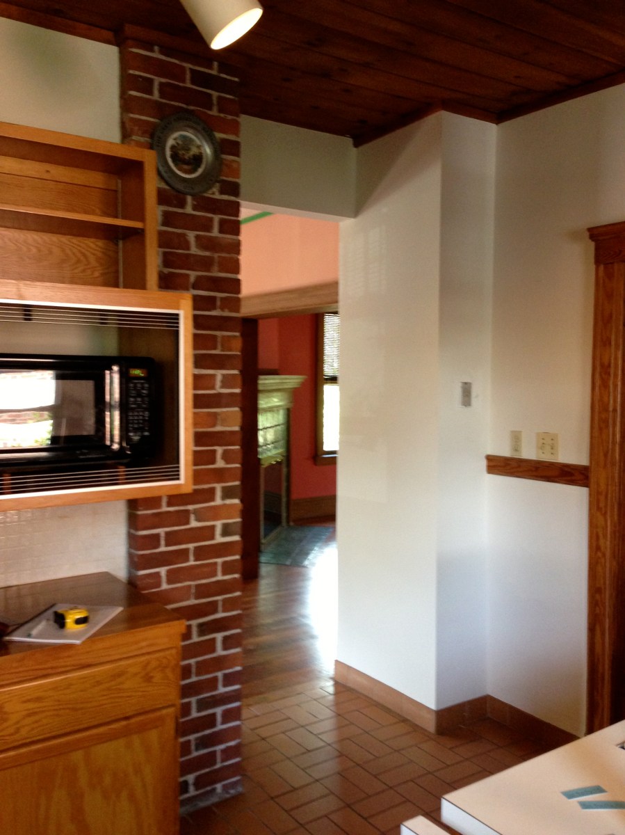 We were able to open up the space between the kitchen, dining room, and living room by eliminating the pipe chases in the header and in the jog in the wall.