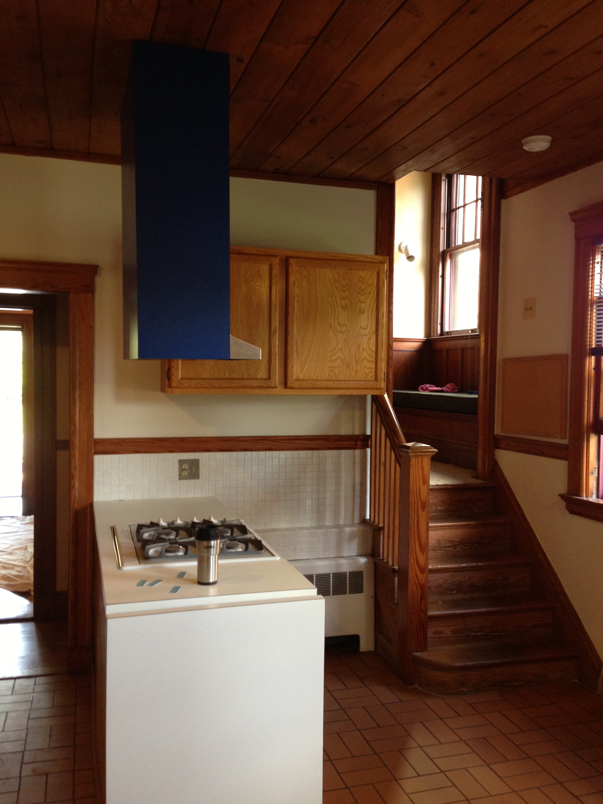 Before, the vent box hanging from the ceiling created a bulky visual obstacle. The radiator was converted to a toe-kick heater to allow more cabinet storage and counter space.
