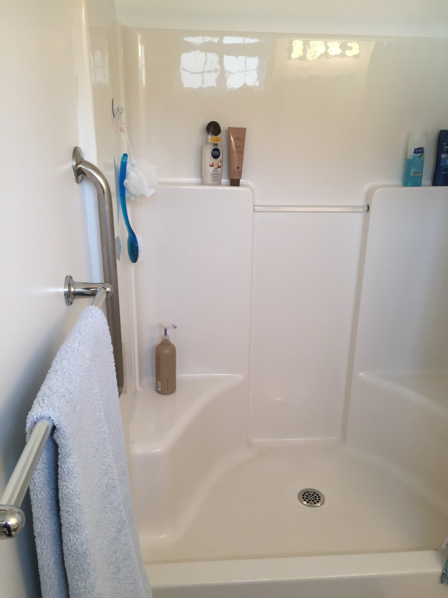 IMG_1966 Published March 7, 2018 at 2448 × 3264 BEFORE – The previous shower’s unused seats took up too much of the footprint. In the new shower the seat can be folded away when not needed.