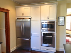 A counter-depth fridge helps keep the space feeling open. A pantry with roll-out shelves provides storage.