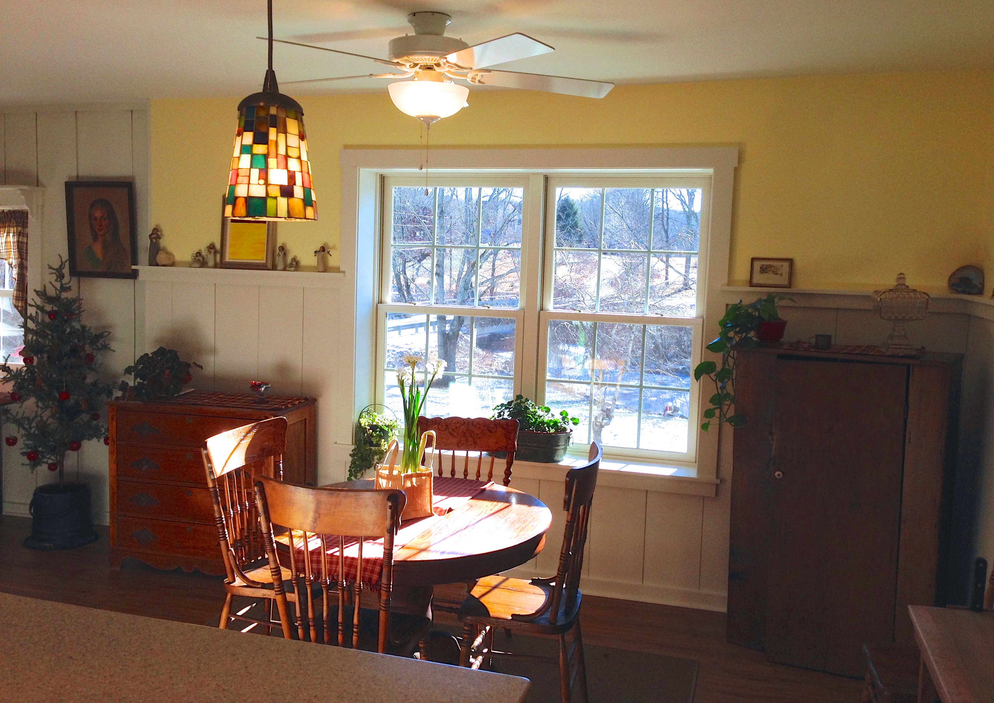 The kitchen is now opened up to the rest of the house, and especially the views of the river bend and pond.