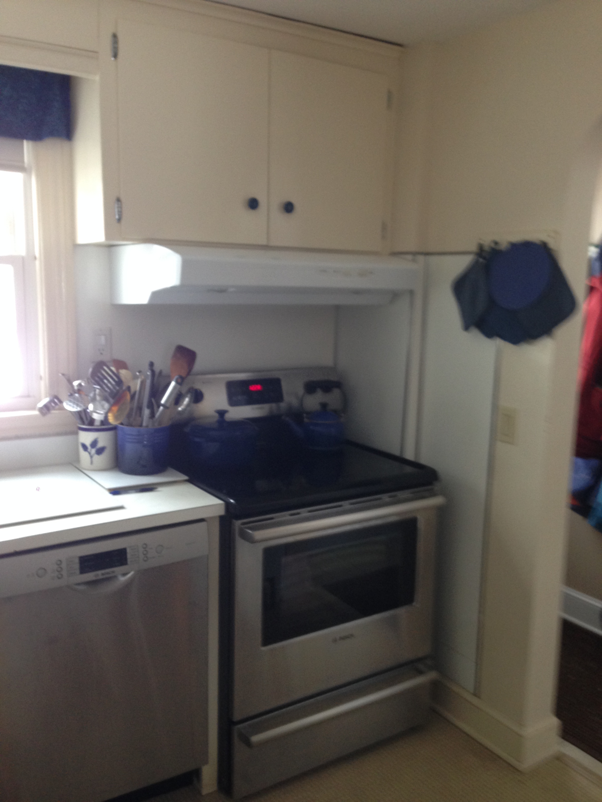 IMG_2586 Published March 6, 2018 at 2448 × 3264 BEFORE – We were able to remove the pipe chase in the corner and use that space for storage, as well as add some counter between the stove and the wall. Moving the dishwasher to the other side of the sink made for a better functioning space.