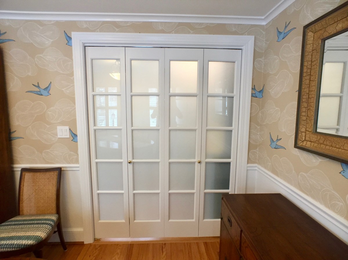 The new doors in the dining room have white laminated glass, which allows light but also a good level of privacy. With the aging in place goals of this project, we wanted to make sure that this room could function as a comfortable bedroom if it ever needed to do that.