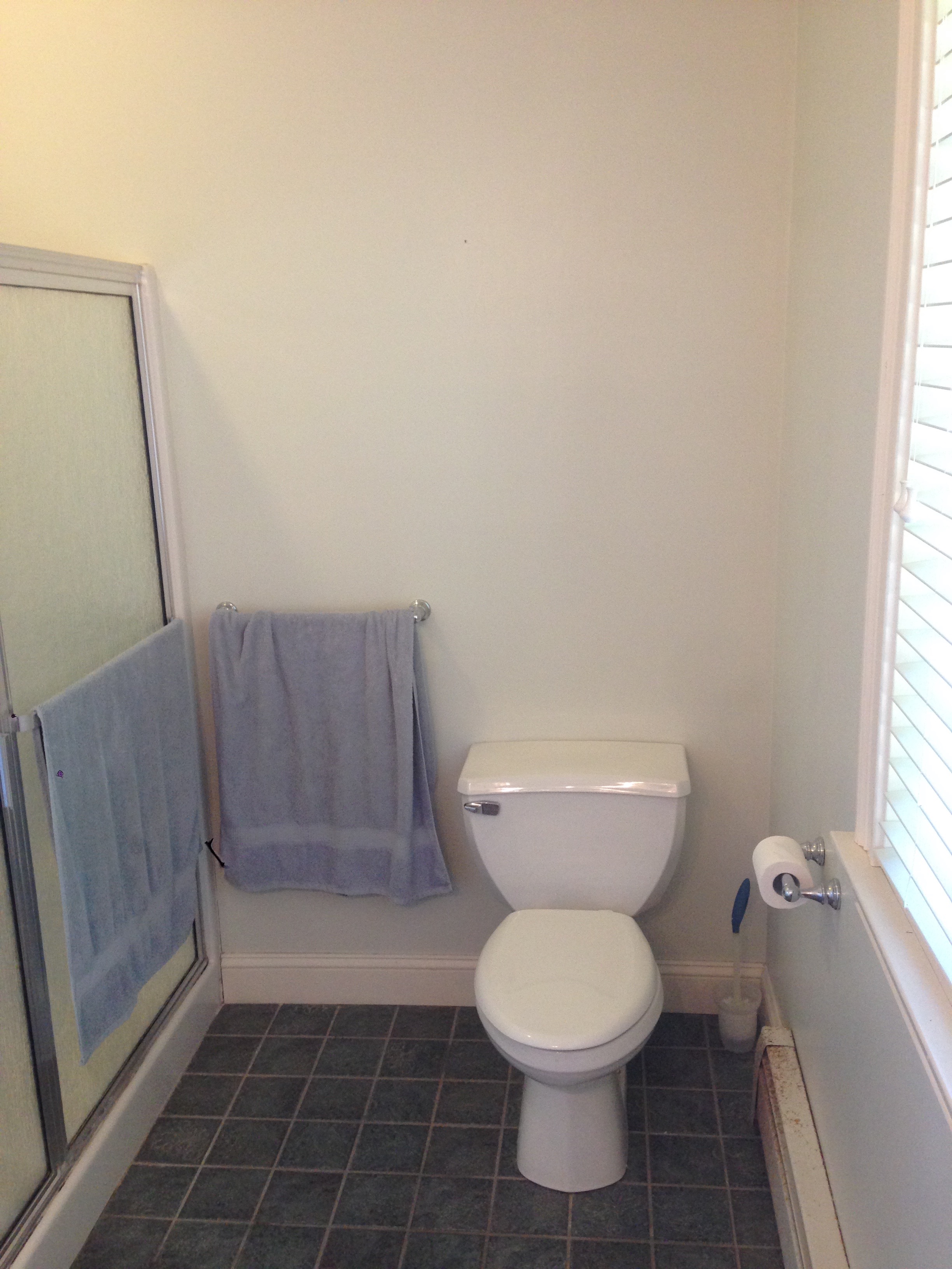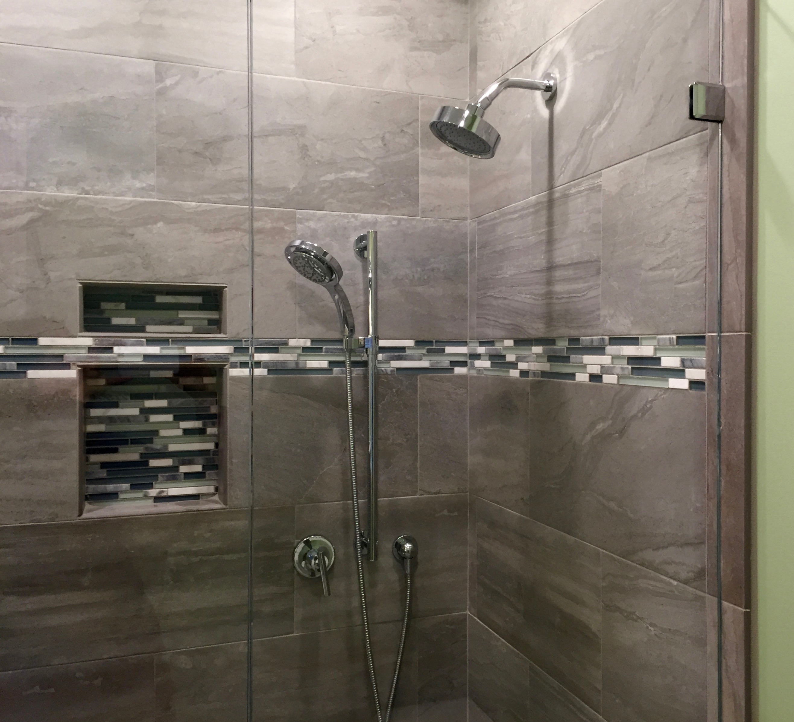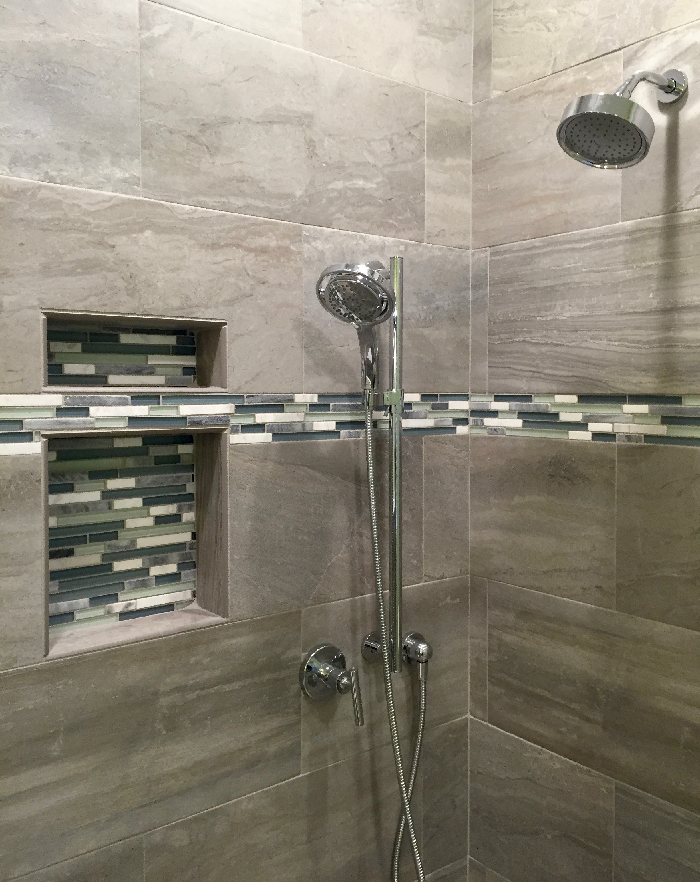- The new tiled shower has a larger footprint than before, and features a rain head, fixed shower head, and hand held shower head. The two level niche provides storage.