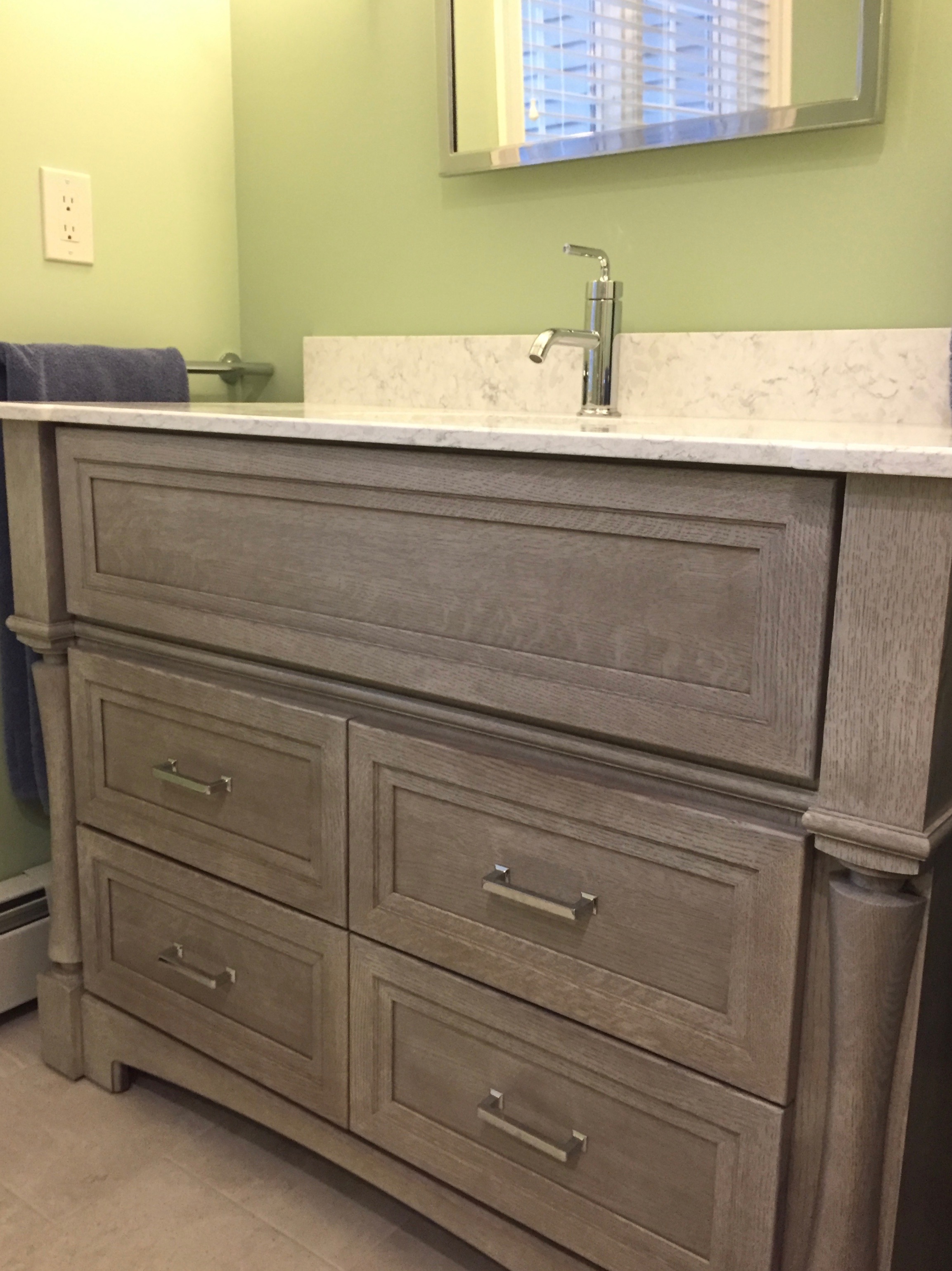 - Nice storage now where before there was only a pedestal sink. Quarter sawn oak cabinets.