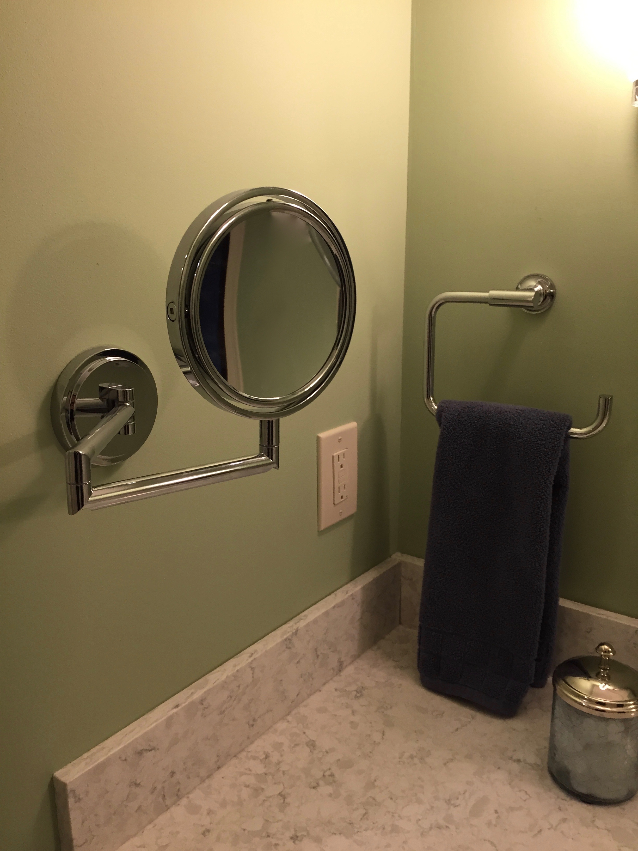 - The original full-height end wall was cut down to only a half wall, opening up the room at the entrance. Controls near the entry on the half help people stay dry while the water gets hot.