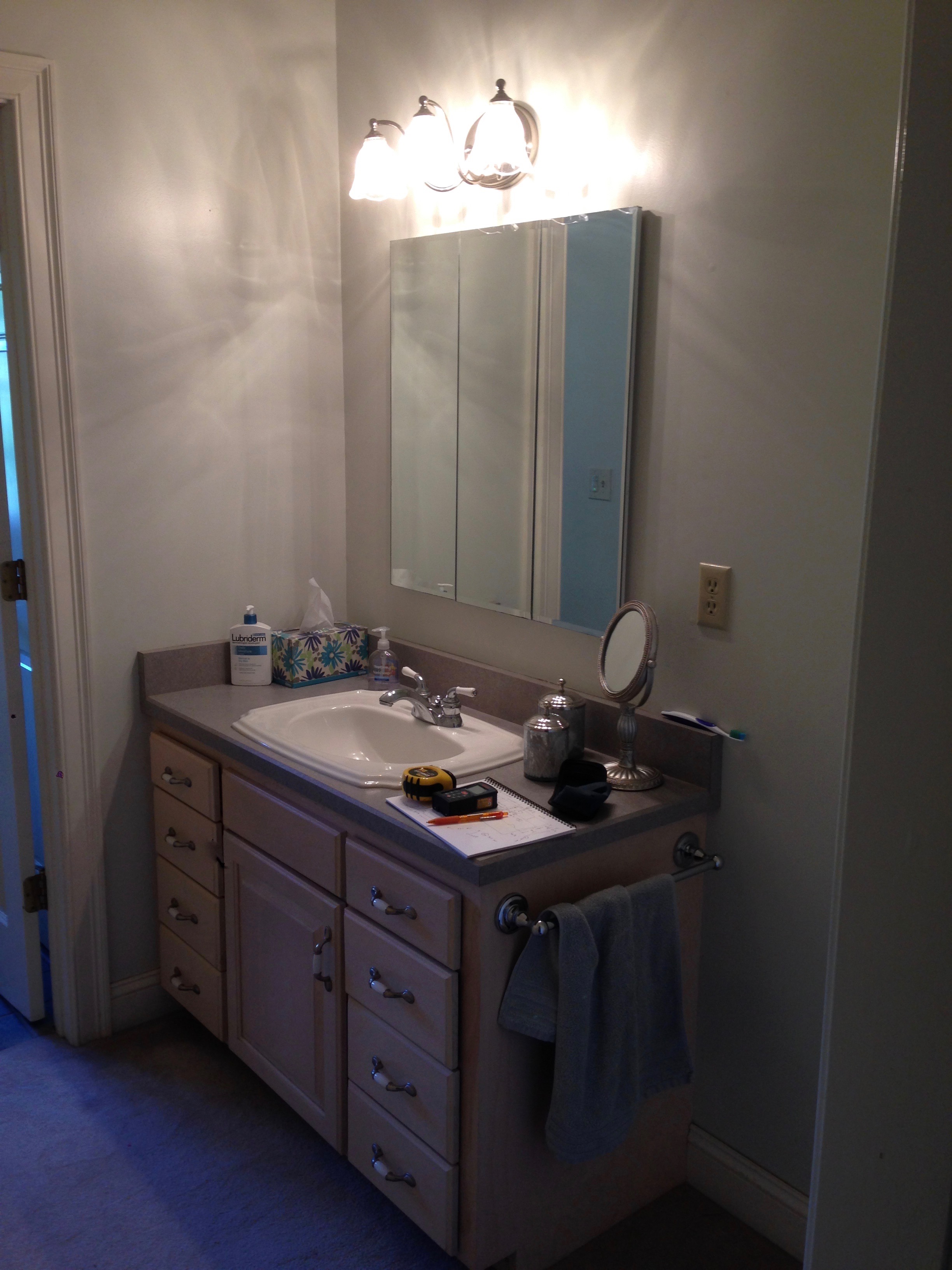 - Before: there was a sizable empty area to the right of the sink cabinet. The renovation brought the cabinets and counters wall-to-wall.